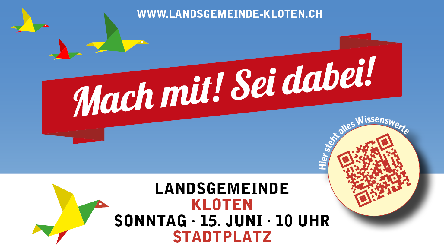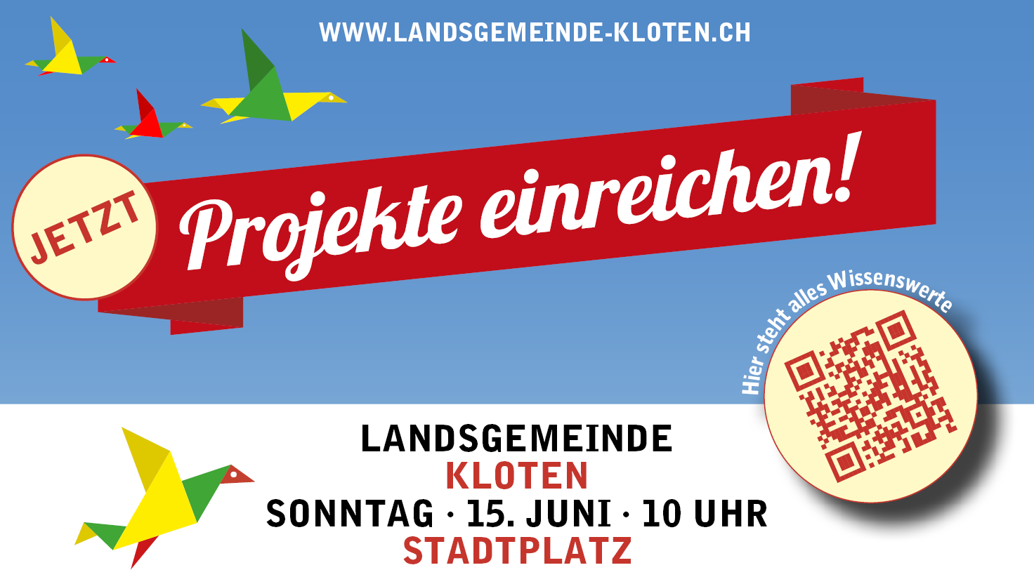 Am 11. Mai endete die Phase zur Projekteingabe. In den vergangenen zwei Monaten wurden insgesamt 66 Projektideen für Kloten eingereicht. Das ist ein Rekord. Wir bedanken uns bei allen, die aktiv mitgemacht und ihre Ideen eingeschickt haben. Jetzt geht es mit der zweiten Phase der Landsgemeinde weiter: Das Online-Voting. Bis zum 1. Juni, 12 Uhr können alle Menschen, welche in Kloten wohnen oder arbeiten für ihre 8 Lieblingsprojekte stimmen, unabhängig vom Alter. Nutzt diese Chance und beteiligt euch bei der Entscheidung. Die 8 Projekte mit den meisten Stimmen erhalten dann am 15. Juni auf dem Stadtplatz die Gelegenheit, sich vor der versammelten Gemeinde zu präsentieren.